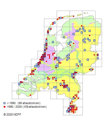 Het aantal atlasblokken (5x5 km) waarin de soort is gemeld binnen een periode van vijf jaar (vanaf 1980) of twintig jaar. Niet gecorrigeerd voor waarnemersinspanning en het aantal doorgegeven waarnemingen kan sterk variëren per periode, dus een trend in verspreiding kan hier niet direct uit worden afgelezen. Het opgegeven jaartal is het eerste jaar van de periode. Bron: gevalideerde waarnemingen uit de NDFF.
