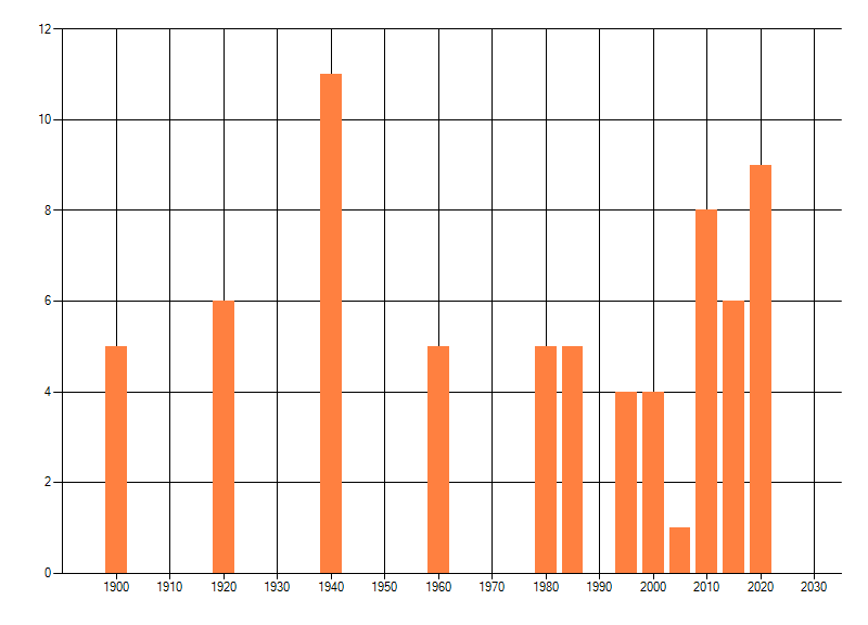 Het aantal atlasblokken (5x5 km) waarin de soort is gemeld binnen een periode van vijf jaar (vanaf 1980) of twintig jaar. Niet gecorrigeerd voor waarnemersinspanning en het aantal doorgegeven waarnemingen kan sterk variëren per periode, dus een trend in verspreiding kan hier niet direct uit worden afgelezen. Het opgegeven jaartal is het eerste jaar van de periode. Bron: gevalideerde waarnemingen uit de NDFF.