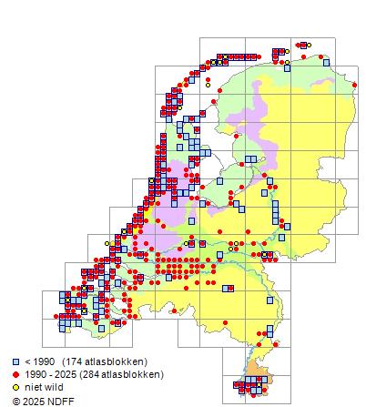 Het aantal atlasblokken (5x5 km) waarin de soort is gemeld binnen een periode van vijf jaar (vanaf 1980) of twintig jaar. Niet gecorrigeerd voor waarnemersinspanning en het aantal doorgegeven waarnemingen kan sterk variëren per periode, dus een trend in verspreiding kan hier niet direct uit worden afgelezen. Het opgegeven jaartal is het eerste jaar van de periode. Bron: gevalideerde waarnemingen uit de NDFF.