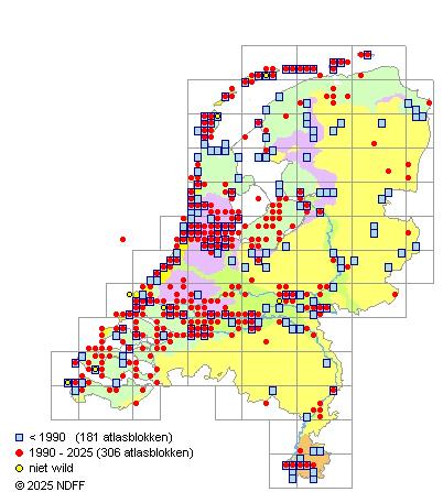 Het aantal atlasblokken (5x5 km) waarin de soort is gemeld binnen een periode van vijf jaar (vanaf 1980) of twintig jaar. Niet gecorrigeerd voor waarnemersinspanning en het aantal doorgegeven waarnemingen kan sterk variëren per periode, dus een trend in verspreiding kan hier niet direct uit worden afgelezen. Het opgegeven jaartal is het eerste jaar van de periode. Bron: gevalideerde waarnemingen uit de NDFF.