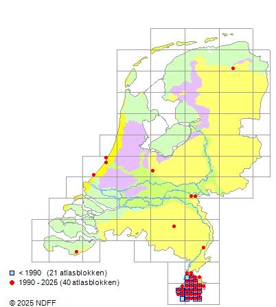 Het aantal atlasblokken (5x5 km) waarin de soort is gemeld binnen een periode van vijf jaar (vanaf 1980) of twintig jaar. Niet gecorrigeerd voor waarnemersinspanning en het aantal doorgegeven waarnemingen kan sterk variëren per periode, dus een trend in verspreiding kan hier niet direct uit worden afgelezen. Het opgegeven jaartal is het eerste jaar van de periode. Bron: gevalideerde waarnemingen uit de NDFF.