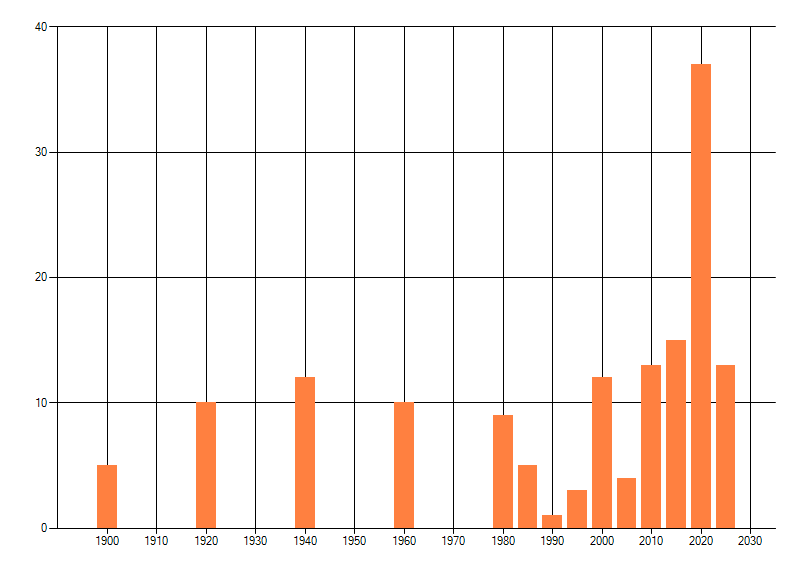 Het aantal atlasblokken (5x5 km) waarin de soort is gemeld binnen een periode van vijf jaar (vanaf 1980) of twintig jaar. Niet gecorrigeerd voor waarnemersinspanning en het aantal doorgegeven waarnemingen kan sterk variëren per periode, dus een trend in verspreiding kan hier niet direct uit worden afgelezen. Het opgegeven jaartal is het eerste jaar van de periode. Bron: gevalideerde waarnemingen uit de NDFF.