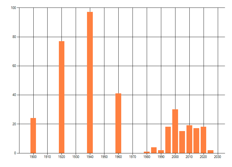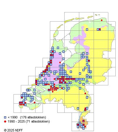 Het aantal atlasblokken (5x5 km) waarin de soort is gemeld binnen een periode van vijf jaar (vanaf 1980) of twintig jaar. Niet gecorrigeerd voor waarnemersinspanning en het aantal doorgegeven waarnemingen kan sterk variëren per periode, dus een trend in verspreiding kan hier niet direct uit worden afgelezen. Het opgegeven jaartal is het eerste jaar van de periode. Bron: gevalideerde waarnemingen uit de NDFF.