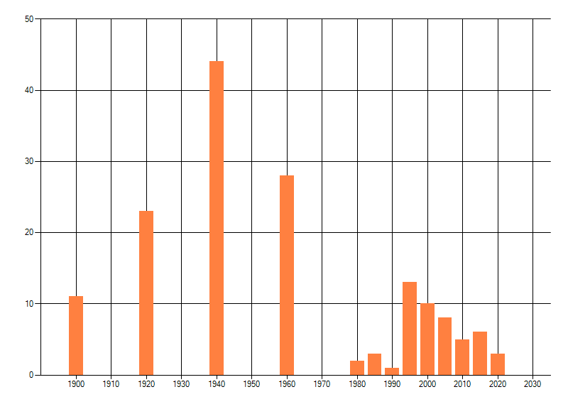 Het aantal atlasblokken (5x5 km) waarin de soort is gemeld binnen een periode van vijf jaar (vanaf 1980) of twintig jaar. Niet gecorrigeerd voor waarnemersinspanning en het aantal doorgegeven waarnemingen kan sterk variëren per periode, dus een trend in verspreiding kan hier niet direct uit worden afgelezen. Het opgegeven jaartal is het eerste jaar van de periode. Bron: gevalideerde waarnemingen uit de NDFF.