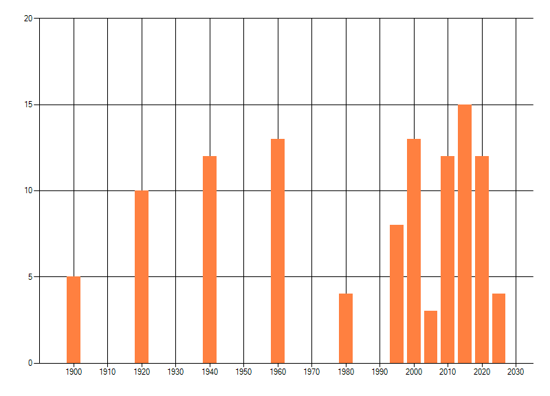 Het aantal atlasblokken (5x5 km) waarin de soort is gemeld binnen een periode van vijf jaar (vanaf 1980) of twintig jaar. Niet gecorrigeerd voor waarnemersinspanning en het aantal doorgegeven waarnemingen kan sterk variëren per periode, dus een trend in verspreiding kan hier niet direct uit worden afgelezen. Het opgegeven jaartal is het eerste jaar van de periode. Bron: gevalideerde waarnemingen uit de NDFF.