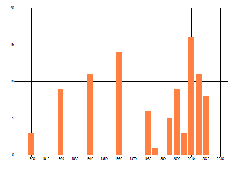 Het aantal atlasblokken (5x5 km) waarin de soort is gemeld binnen een periode van vijf jaar (vanaf 1980) of twintig jaar. Niet gecorrigeerd voor waarnemersinspanning en het aantal doorgegeven waarnemingen kan sterk variëren per periode, dus een trend in verspreiding kan hier niet direct uit worden afgelezen. Het opgegeven jaartal is het eerste jaar van de periode. Bron: gevalideerde waarnemingen uit de NDFF.