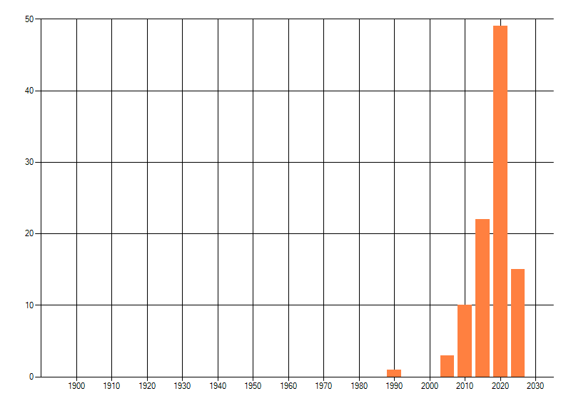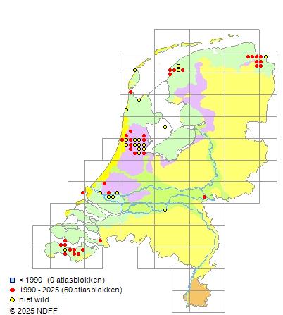 Het aantal atlasblokken (5x5 km) waarin de soort is gemeld binnen een periode van vijf jaar (vanaf 1980) of twintig jaar. Niet gecorrigeerd voor waarnemersinspanning en het aantal doorgegeven waarnemingen kan sterk variëren per periode, dus een trend in verspreiding kan hier niet direct uit worden afgelezen. Het opgegeven jaartal is het eerste jaar van de periode. Bron: gevalideerde waarnemingen uit de NDFF.