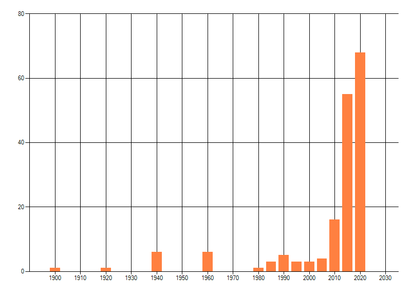 Het aantal atlasblokken (5x5 km) waarin de soort is gemeld binnen een periode van vijf jaar (vanaf 1980) of twintig jaar. Niet gecorrigeerd voor waarnemersinspanning en het aantal doorgegeven waarnemingen kan sterk variëren per periode, dus een trend in verspreiding kan hier niet direct uit worden afgelezen. Het opgegeven jaartal is het eerste jaar van de periode. Bron: gevalideerde waarnemingen uit de NDFF.