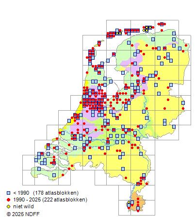 Het aantal atlasblokken (5x5 km) waarin de soort is gemeld binnen een periode van vijf jaar (vanaf 1980) of twintig jaar. Niet gecorrigeerd voor waarnemersinspanning en het aantal doorgegeven waarnemingen kan sterk variëren per periode, dus een trend in verspreiding kan hier niet direct uit worden afgelezen. Het opgegeven jaartal is het eerste jaar van de periode. Bron: gevalideerde waarnemingen uit de NDFF.