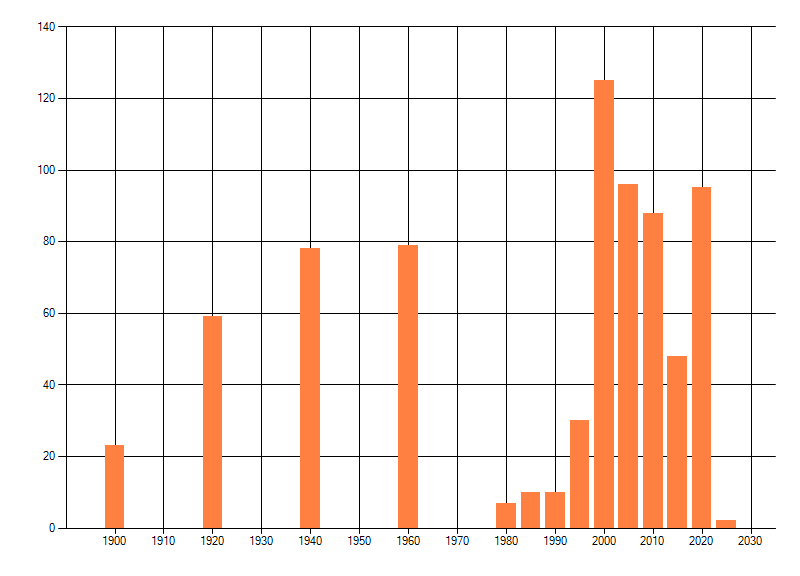 Het aantal atlasblokken (5x5 km) waarin de soort is gemeld binnen een periode van vijf jaar (vanaf 1980) of twintig jaar. Niet gecorrigeerd voor waarnemersinspanning en het aantal doorgegeven waarnemingen kan sterk variëren per periode, dus een trend in verspreiding kan hier niet direct uit worden afgelezen. Het opgegeven jaartal is het eerste jaar van de periode. Bron: gevalideerde waarnemingen uit de NDFF.