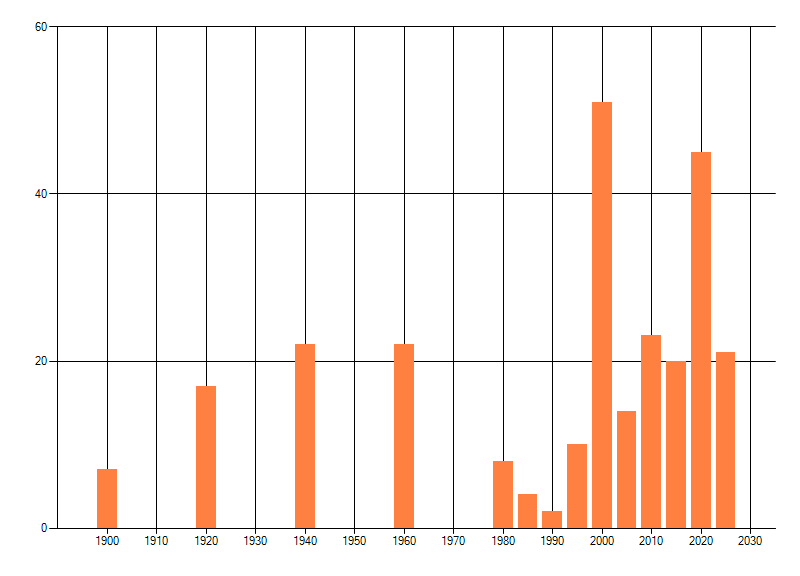 Het aantal atlasblokken (5x5 km) waarin de soort is gemeld binnen een periode van vijf jaar (vanaf 1980) of twintig jaar. Niet gecorrigeerd voor waarnemersinspanning en het aantal doorgegeven waarnemingen kan sterk variëren per periode, dus een trend in verspreiding kan hier niet direct uit worden afgelezen. Het opgegeven jaartal is het eerste jaar van de periode. Bron: gevalideerde waarnemingen uit de NDFF.
