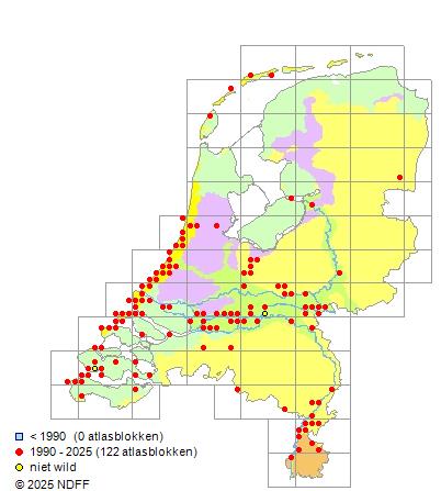 Het aantal atlasblokken (5x5 km) waarin de soort is gemeld binnen een periode van vijf jaar (vanaf 1980) of twintig jaar. Niet gecorrigeerd voor waarnemersinspanning en het aantal doorgegeven waarnemingen kan sterk variëren per periode, dus een trend in verspreiding kan hier niet direct uit worden afgelezen. Het opgegeven jaartal is het eerste jaar van de periode. Bron: gevalideerde waarnemingen uit de NDFF.