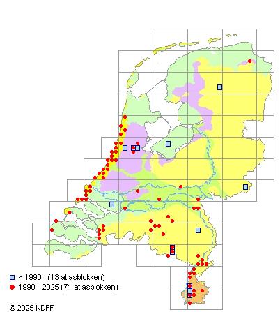 Het aantal atlasblokken (5x5 km) waarin de soort is gemeld binnen een periode van vijf jaar (vanaf 1980) of twintig jaar. Niet gecorrigeerd voor waarnemersinspanning en het aantal doorgegeven waarnemingen kan sterk variëren per periode, dus een trend in verspreiding kan hier niet direct uit worden afgelezen. Het opgegeven jaartal is het eerste jaar van de periode. Bron: gevalideerde waarnemingen uit de NDFF.