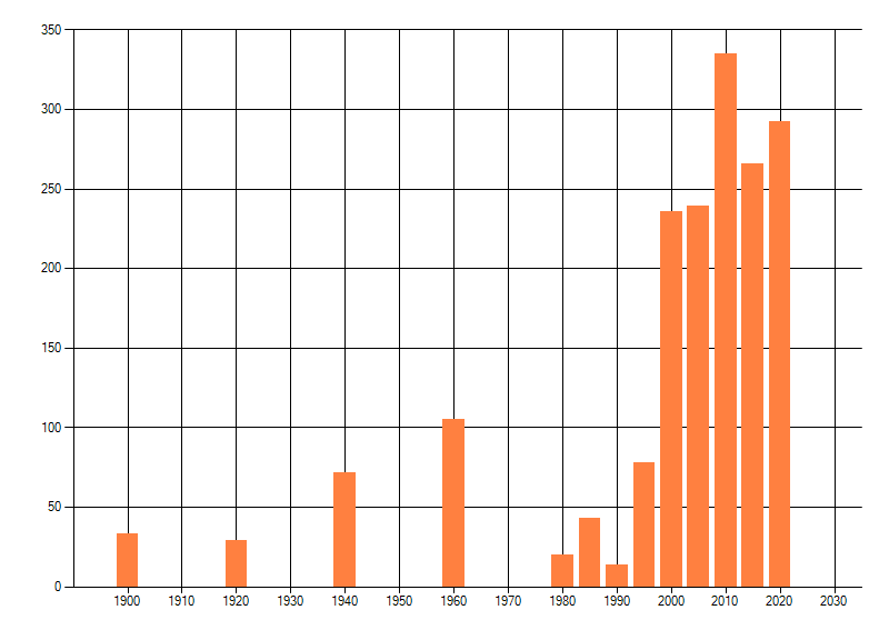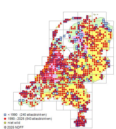 Het aantal atlasblokken (5x5 km) waarin de soort is gemeld binnen een periode van vijf jaar (vanaf 1980) of twintig jaar. Niet gecorrigeerd voor waarnemersinspanning en het aantal doorgegeven waarnemingen kan sterk variëren per periode, dus een trend in verspreiding kan hier niet direct uit worden afgelezen. Het opgegeven jaartal is het eerste jaar van de periode. Bron: gevalideerde waarnemingen uit de NDFF.