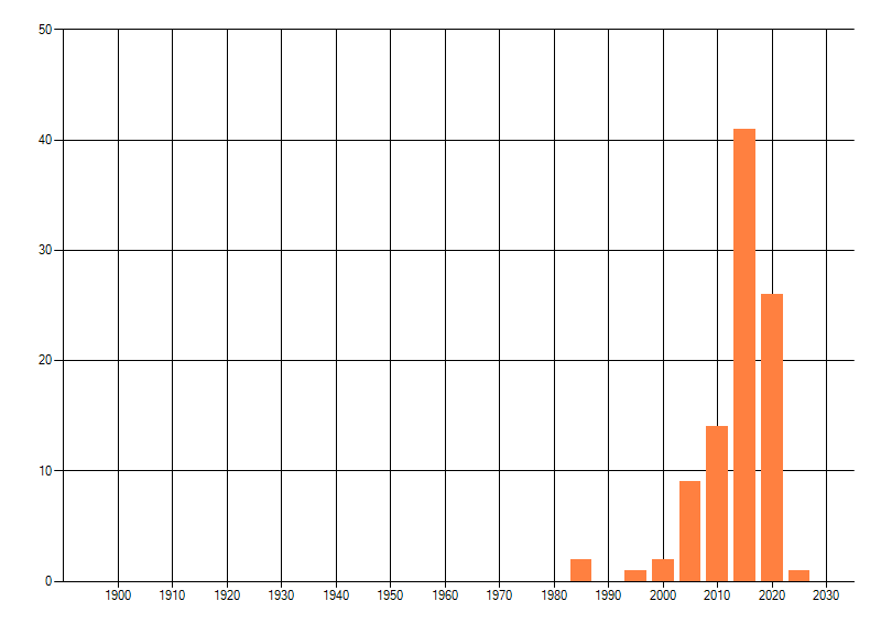 Het aantal atlasblokken (5x5 km) waarin de soort is gemeld binnen een periode van vijf jaar (vanaf 1980) of twintig jaar. Niet gecorrigeerd voor waarnemersinspanning en het aantal doorgegeven waarnemingen kan sterk variëren per periode, dus een trend in verspreiding kan hier niet direct uit worden afgelezen. Het opgegeven jaartal is het eerste jaar van de periode. Bron: gevalideerde waarnemingen uit de NDFF.