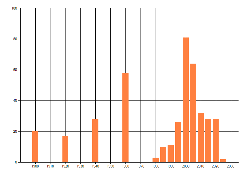 Het aantal atlasblokken (5x5 km) waarin de soort is gemeld binnen een periode van vijf jaar (vanaf 1980) of twintig jaar. Niet gecorrigeerd voor waarnemersinspanning en het aantal doorgegeven waarnemingen kan sterk variëren per periode, dus een trend in verspreiding kan hier niet direct uit worden afgelezen. Het opgegeven jaartal is het eerste jaar van de periode. Bron: gevalideerde waarnemingen uit de NDFF.