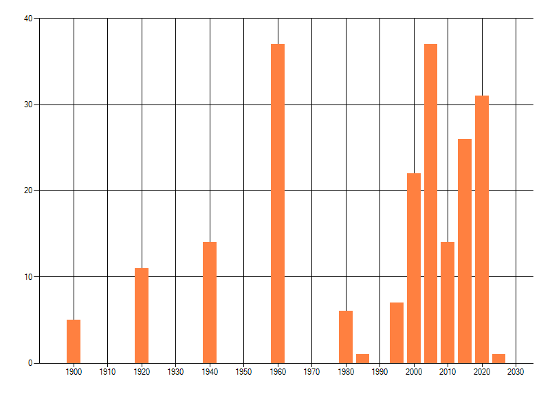 Het aantal atlasblokken (5x5 km) waarin de soort is gemeld binnen een periode van vijf jaar (vanaf 1980) of twintig jaar. Niet gecorrigeerd voor waarnemersinspanning en het aantal doorgegeven waarnemingen kan sterk variëren per periode, dus een trend in verspreiding kan hier niet direct uit worden afgelezen. Het opgegeven jaartal is het eerste jaar van de periode. Bron: gevalideerde waarnemingen uit de NDFF.
