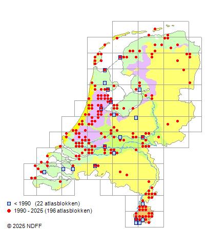 Het aantal atlasblokken (5x5 km) waarin de soort is gemeld binnen een periode van vijf jaar (vanaf 1980) of twintig jaar. Niet gecorrigeerd voor waarnemersinspanning en het aantal doorgegeven waarnemingen kan sterk variëren per periode, dus een trend in verspreiding kan hier niet direct uit worden afgelezen. Het opgegeven jaartal is het eerste jaar van de periode. Bron: gevalideerde waarnemingen uit de NDFF.