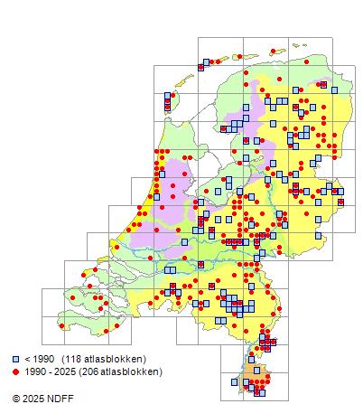Het aantal atlasblokken (5x5 km) waarin de soort is gemeld binnen een periode van vijf jaar (vanaf 1980) of twintig jaar. Niet gecorrigeerd voor waarnemersinspanning en het aantal doorgegeven waarnemingen kan sterk variëren per periode, dus een trend in verspreiding kan hier niet direct uit worden afgelezen. Het opgegeven jaartal is het eerste jaar van de periode. Bron: gevalideerde waarnemingen uit de NDFF.