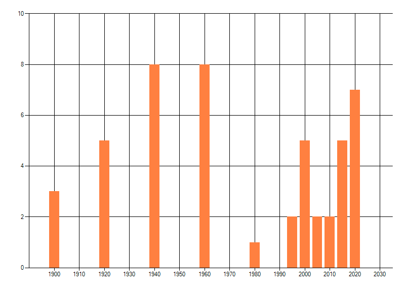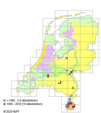 Het aantal atlasblokken (5x5 km) waarin de soort is gemeld binnen een periode van vijf jaar (vanaf 1980) of twintig jaar. Niet gecorrigeerd voor waarnemersinspanning en het aantal doorgegeven waarnemingen kan sterk variëren per periode, dus een trend in verspreiding kan hier niet direct uit worden afgelezen. Het opgegeven jaartal is het eerste jaar van de periode. Bron: gevalideerde waarnemingen uit de NDFF.