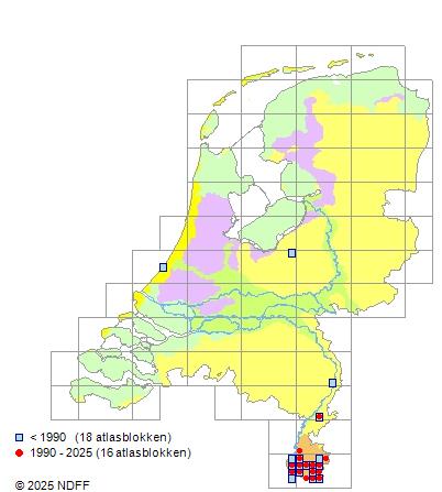 Het aantal atlasblokken (5x5 km) waarin de soort is gemeld binnen een periode van vijf jaar (vanaf 1980) of twintig jaar. Niet gecorrigeerd voor waarnemersinspanning en het aantal doorgegeven waarnemingen kan sterk variëren per periode, dus een trend in verspreiding kan hier niet direct uit worden afgelezen. Het opgegeven jaartal is het eerste jaar van de periode. Bron: gevalideerde waarnemingen uit de NDFF.
