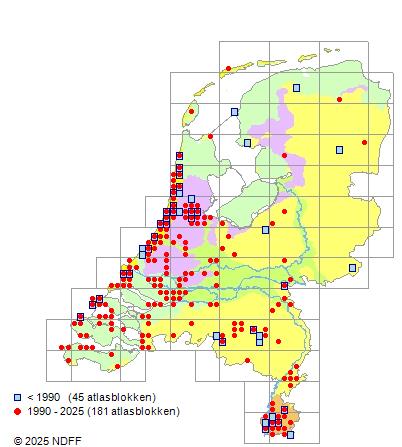 Het aantal atlasblokken (5x5 km) waarin de soort is gemeld binnen een periode van vijf jaar (vanaf 1980) of twintig jaar. Niet gecorrigeerd voor waarnemersinspanning en het aantal doorgegeven waarnemingen kan sterk variëren per periode, dus een trend in verspreiding kan hier niet direct uit worden afgelezen. Het opgegeven jaartal is het eerste jaar van de periode. Bron: gevalideerde waarnemingen uit de NDFF.