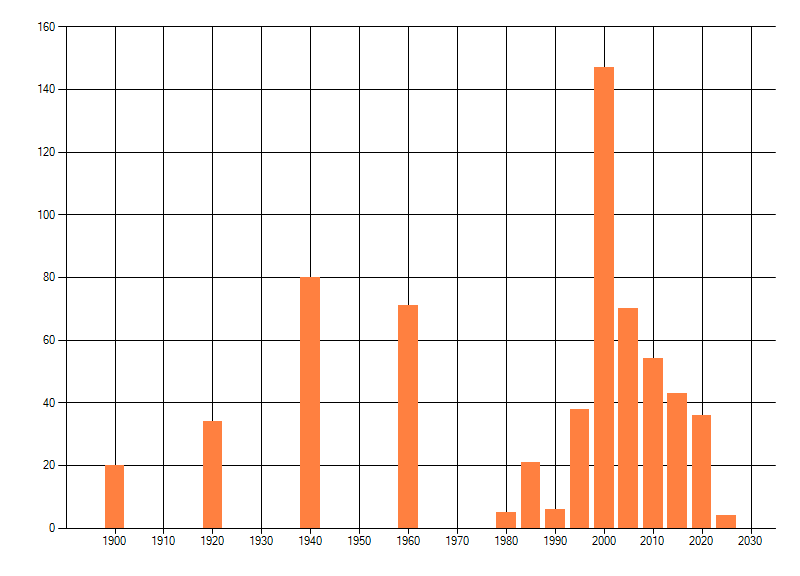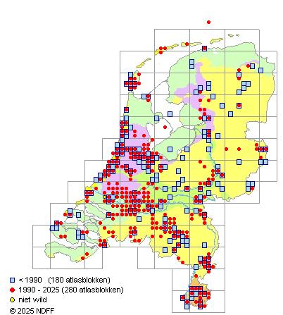 Het aantal atlasblokken (5x5 km) waarin de soort is gemeld binnen een periode van vijf jaar (vanaf 1980) of twintig jaar. Niet gecorrigeerd voor waarnemersinspanning en het aantal doorgegeven waarnemingen kan sterk variëren per periode, dus een trend in verspreiding kan hier niet direct uit worden afgelezen. Het opgegeven jaartal is het eerste jaar van de periode. Bron: gevalideerde waarnemingen uit de NDFF.
