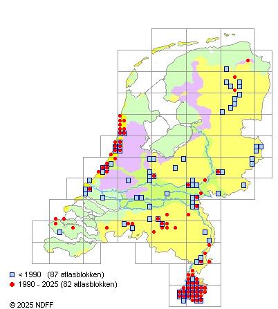 Het aantal atlasblokken (5x5 km) waarin de soort is gemeld binnen een periode van vijf jaar (vanaf 1980) of twintig jaar. Niet gecorrigeerd voor waarnemersinspanning en het aantal doorgegeven waarnemingen kan sterk variëren per periode, dus een trend in verspreiding kan hier niet direct uit worden afgelezen. Het opgegeven jaartal is het eerste jaar van de periode. Bron: gevalideerde waarnemingen uit de NDFF.