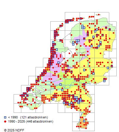 Het aantal atlasblokken (5x5 km) waarin de soort is gemeld binnen een periode van vijf jaar (vanaf 1980) of twintig jaar. Niet gecorrigeerd voor waarnemersinspanning en het aantal doorgegeven waarnemingen kan sterk variëren per periode, dus een trend in verspreiding kan hier niet direct uit worden afgelezen. Het opgegeven jaartal is het eerste jaar van de periode. Bron: gevalideerde waarnemingen uit de NDFF.