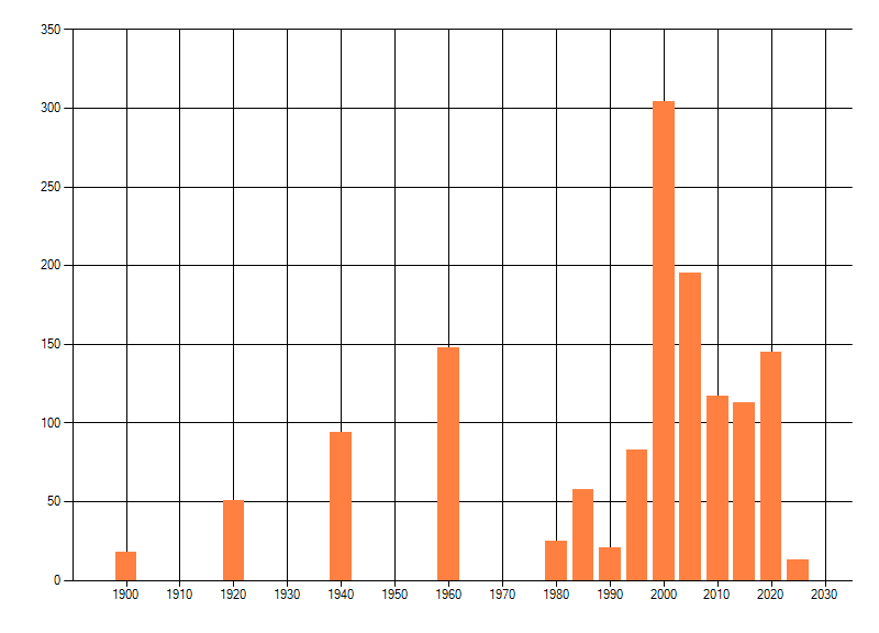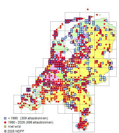 Het aantal atlasblokken (5x5 km) waarin de soort is gemeld binnen een periode van vijf jaar (vanaf 1980) of twintig jaar. Niet gecorrigeerd voor waarnemersinspanning en het aantal doorgegeven waarnemingen kan sterk variëren per periode, dus een trend in verspreiding kan hier niet direct uit worden afgelezen. Het opgegeven jaartal is het eerste jaar van de periode. Bron: gevalideerde waarnemingen uit de NDFF.
