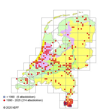 Het aantal atlasblokken (5x5 km) waarin de soort is gemeld binnen een periode van vijf jaar (vanaf 1980) of twintig jaar. Niet gecorrigeerd voor waarnemersinspanning en het aantal doorgegeven waarnemingen kan sterk variëren per periode, dus een trend in verspreiding kan hier niet direct uit worden afgelezen. Het opgegeven jaartal is het eerste jaar van de periode. Bron: gevalideerde waarnemingen uit de NDFF.