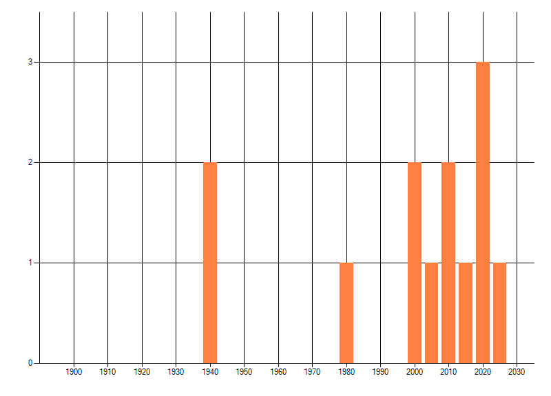 Het aantal atlasblokken (5x5 km) waarin de soort is gemeld binnen een periode van vijf jaar (vanaf 1980) of twintig jaar. Niet gecorrigeerd voor waarnemersinspanning en het aantal doorgegeven waarnemingen kan sterk variëren per periode, dus een trend in verspreiding kan hier niet direct uit worden afgelezen. Het opgegeven jaartal is het eerste jaar van de periode. Bron: gevalideerde waarnemingen uit de NDFF.
