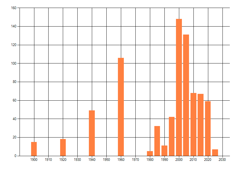 Het aantal atlasblokken (5x5 km) waarin de soort is gemeld binnen een periode van vijf jaar (vanaf 1980) of twintig jaar. Niet gecorrigeerd voor waarnemersinspanning en het aantal doorgegeven waarnemingen kan sterk variëren per periode, dus een trend in verspreiding kan hier niet direct uit worden afgelezen. Het opgegeven jaartal is het eerste jaar van de periode. Bron: gevalideerde waarnemingen uit de NDFF.