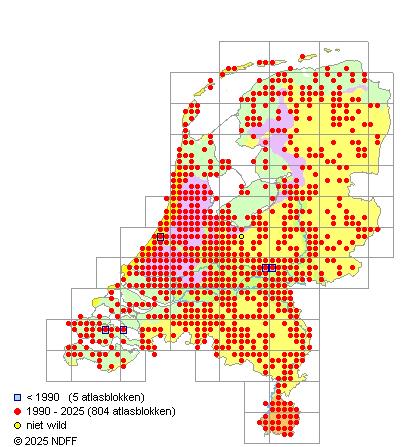 Het aantal atlasblokken (5x5 km) waarin de soort is gemeld binnen een periode van vijf jaar (vanaf 1980) of twintig jaar. Niet gecorrigeerd voor waarnemersinspanning en het aantal doorgegeven waarnemingen kan sterk variëren per periode, dus een trend in verspreiding kan hier niet direct uit worden afgelezen. Het opgegeven jaartal is het eerste jaar van de periode. Bron: gevalideerde waarnemingen uit de NDFF.