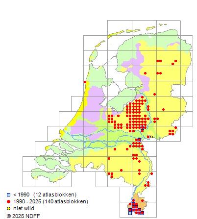 Het aantal atlasblokken (5x5 km) waarin de soort is gemeld binnen een periode van vijf jaar (vanaf 1980) of twintig jaar. Niet gecorrigeerd voor waarnemersinspanning en het aantal doorgegeven waarnemingen kan sterk variëren per periode, dus een trend in verspreiding kan hier niet direct uit worden afgelezen. Het opgegeven jaartal is het eerste jaar van de periode. Bron: gevalideerde waarnemingen uit de NDFF.