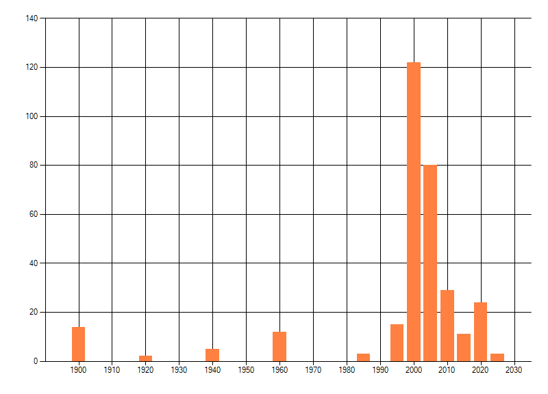 Het aantal atlasblokken (5x5 km) waarin de soort is gemeld binnen een periode van vijf jaar (vanaf 1980) of twintig jaar. Niet gecorrigeerd voor waarnemersinspanning en het aantal doorgegeven waarnemingen kan sterk variëren per periode, dus een trend in verspreiding kan hier niet direct uit worden afgelezen. Het opgegeven jaartal is het eerste jaar van de periode. Bron: gevalideerde waarnemingen uit de NDFF.