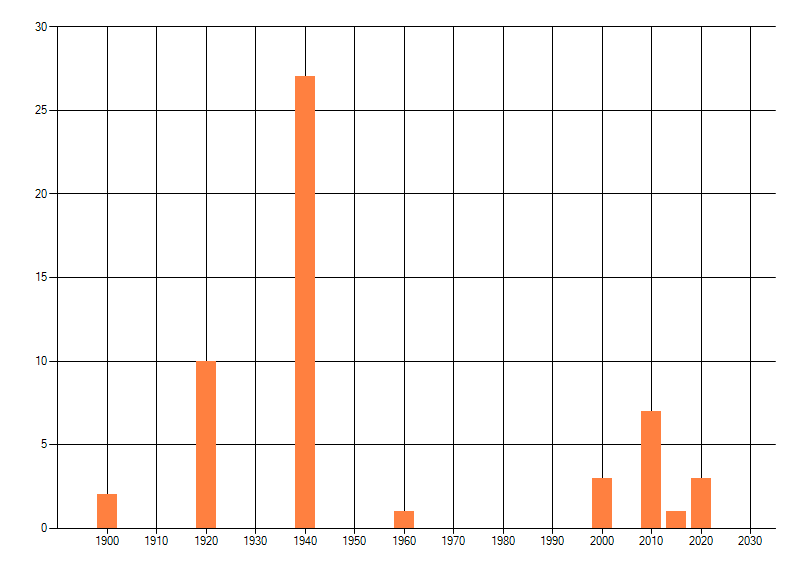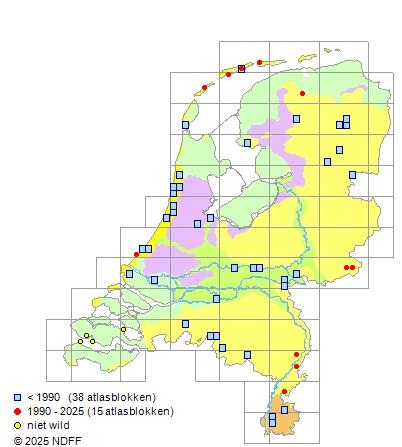 Het aantal atlasblokken (5x5 km) waarin de soort is gemeld binnen een periode van vijf jaar (vanaf 1980) of twintig jaar. Niet gecorrigeerd voor waarnemersinspanning en het aantal doorgegeven waarnemingen kan sterk variëren per periode, dus een trend in verspreiding kan hier niet direct uit worden afgelezen. Het opgegeven jaartal is het eerste jaar van de periode. Bron: gevalideerde waarnemingen uit de NDFF.