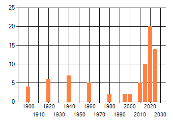 Het aantal atlasblokken (5x5 km) waarin de soort is gemeld binnen een periode van vijf jaar (vanaf 1980) of twintig jaar. Niet gecorrigeerd voor waarnemersinspanning en het aantal doorgegeven waarnemingen kan sterk variëren per periode, dus een trend in verspreiding kan hier niet direct uit worden afgelezen. Het opgegeven jaartal is het eerste jaar van de periode. Bron: gevalideerde waarnemingen uit de NDFF.