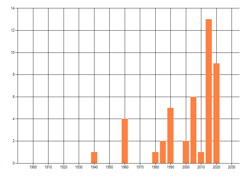 Het aantal atlasblokken (5x5 km) waarin de soort is gemeld binnen een periode van vijf jaar (vanaf 1980) of twintig jaar. Niet gecorrigeerd voor waarnemersinspanning en het aantal doorgegeven waarnemingen kan sterk variëren per periode, dus een trend in verspreiding kan hier niet direct uit worden afgelezen. Het opgegeven jaartal is het eerste jaar van de periode. Bron: gevalideerde waarnemingen uit de NDFF.