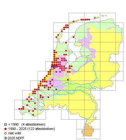 Het aantal atlasblokken (5x5 km) waarin de soort is gemeld binnen een periode van vijf jaar (vanaf 1980) of twintig jaar. Niet gecorrigeerd voor waarnemersinspanning en het aantal doorgegeven waarnemingen kan sterk variëren per periode, dus een trend in verspreiding kan hier niet direct uit worden afgelezen. Het opgegeven jaartal is het eerste jaar van de periode. Bron: gevalideerde waarnemingen uit de NDFF.