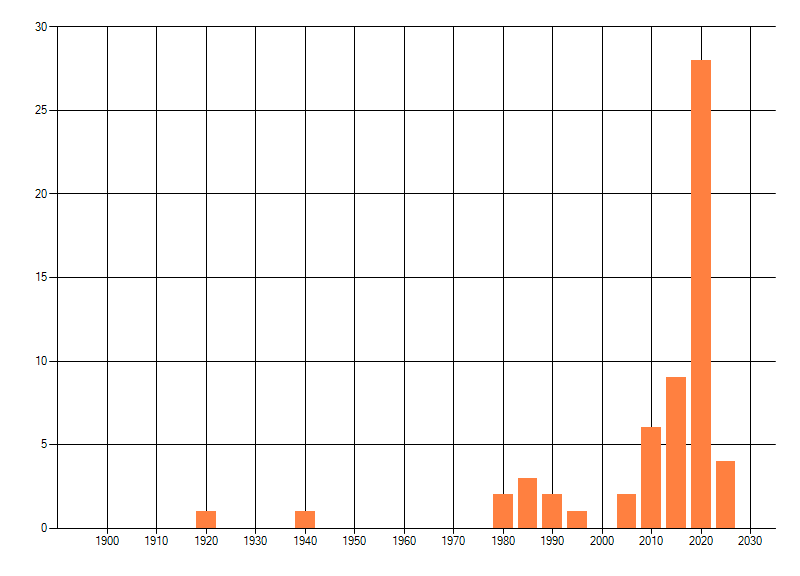 Het aantal atlasblokken (5x5 km) waarin de soort is gemeld binnen een periode van vijf jaar (vanaf 1980) of twintig jaar. Niet gecorrigeerd voor waarnemersinspanning en het aantal doorgegeven waarnemingen kan sterk variëren per periode, dus een trend in verspreiding kan hier niet direct uit worden afgelezen. Het opgegeven jaartal is het eerste jaar van de periode. Bron: gevalideerde waarnemingen uit de NDFF.