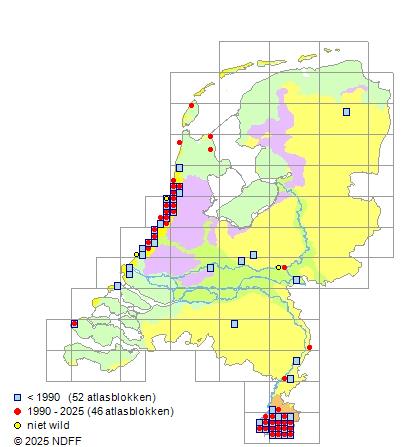 Het aantal atlasblokken (5x5 km) waarin de soort is gemeld binnen een periode van vijf jaar (vanaf 1980) of twintig jaar. Niet gecorrigeerd voor waarnemersinspanning en het aantal doorgegeven waarnemingen kan sterk variëren per periode, dus een trend in verspreiding kan hier niet direct uit worden afgelezen. Het opgegeven jaartal is het eerste jaar van de periode. Bron: gevalideerde waarnemingen uit de NDFF.