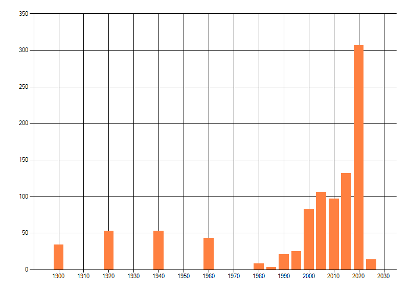 Het aantal atlasblokken (5x5 km) waarin de soort is gemeld binnen een periode van vijf jaar (vanaf 1980) of twintig jaar. Niet gecorrigeerd voor waarnemersinspanning en het aantal doorgegeven waarnemingen kan sterk variëren per periode, dus een trend in verspreiding kan hier niet direct uit worden afgelezen. Het opgegeven jaartal is het eerste jaar van de periode. Bron: gevalideerde waarnemingen uit de NDFF.