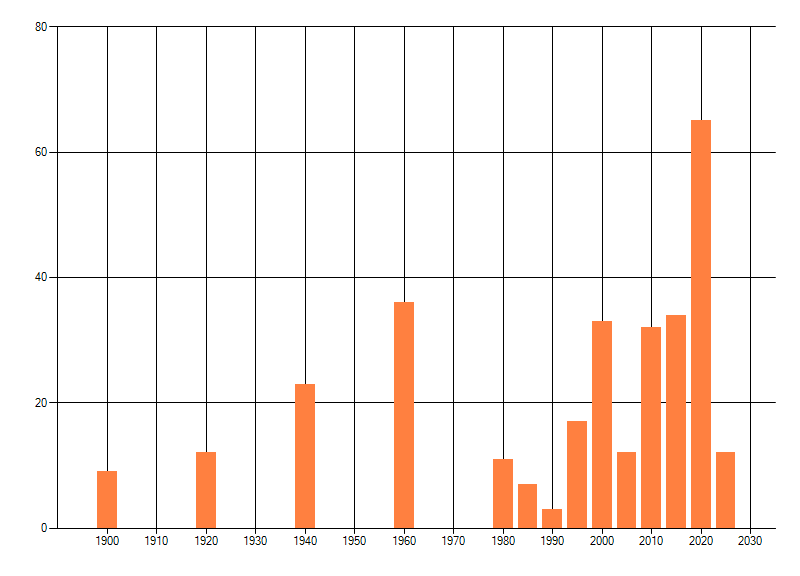 Het aantal atlasblokken (5x5 km) waarin de soort is gemeld binnen een periode van vijf jaar (vanaf 1980) of twintig jaar. Niet gecorrigeerd voor waarnemersinspanning en het aantal doorgegeven waarnemingen kan sterk variëren per periode, dus een trend in verspreiding kan hier niet direct uit worden afgelezen. Het opgegeven jaartal is het eerste jaar van de periode. Bron: gevalideerde waarnemingen uit de NDFF.