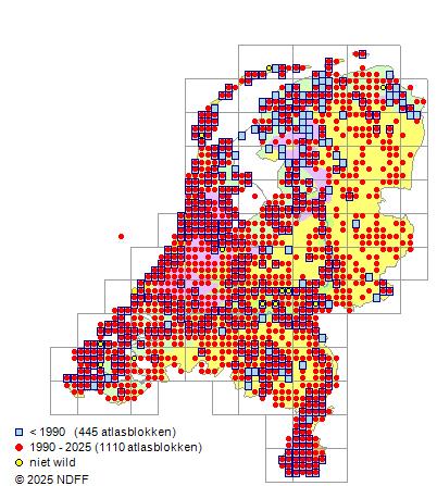 Het aantal atlasblokken (5x5 km) waarin de soort is gemeld binnen een periode van vijf jaar (vanaf 1980) of twintig jaar. Niet gecorrigeerd voor waarnemersinspanning en het aantal doorgegeven waarnemingen kan sterk variëren per periode, dus een trend in verspreiding kan hier niet direct uit worden afgelezen. Het opgegeven jaartal is het eerste jaar van de periode. Bron: gevalideerde waarnemingen uit de NDFF.