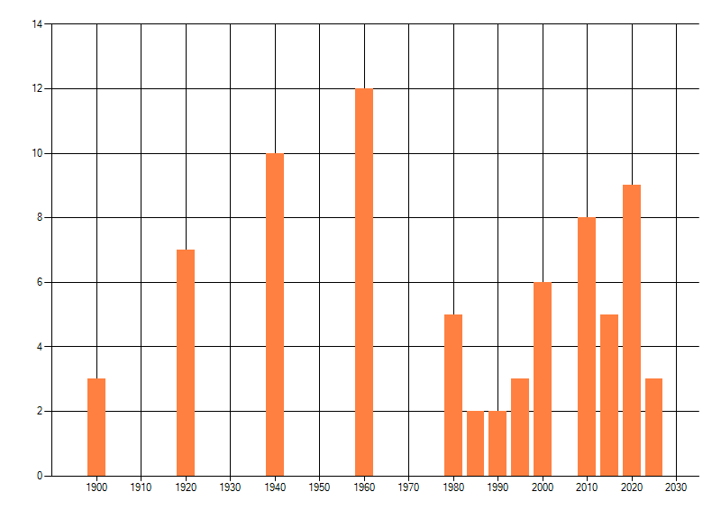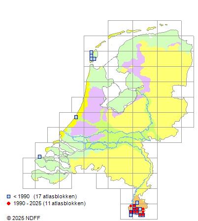Het aantal atlasblokken (5x5 km) waarin de soort is gemeld binnen een periode van vijf jaar (vanaf 1980) of twintig jaar. Niet gecorrigeerd voor waarnemersinspanning en het aantal doorgegeven waarnemingen kan sterk variëren per periode, dus een trend in verspreiding kan hier niet direct uit worden afgelezen. Het opgegeven jaartal is het eerste jaar van de periode. Bron: gevalideerde waarnemingen uit de NDFF.