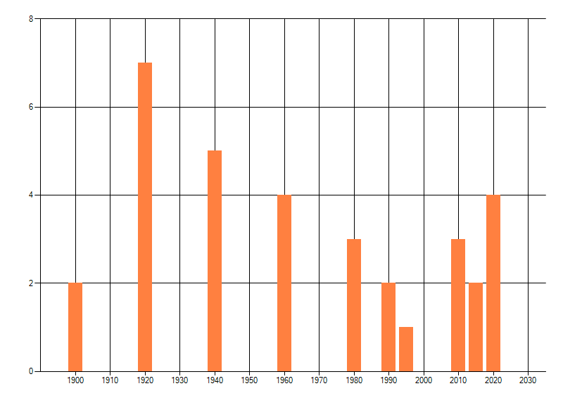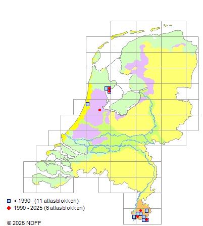 Het aantal atlasblokken (5x5 km) waarin de soort is gemeld binnen een periode van vijf jaar (vanaf 1980) of twintig jaar. Niet gecorrigeerd voor waarnemersinspanning en het aantal doorgegeven waarnemingen kan sterk variëren per periode, dus een trend in verspreiding kan hier niet direct uit worden afgelezen. Het opgegeven jaartal is het eerste jaar van de periode. Bron: gevalideerde waarnemingen uit de NDFF.