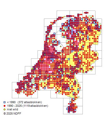 Het aantal atlasblokken (5x5 km) waarin de soort is gemeld binnen een periode van vijf jaar (vanaf 1980) of twintig jaar. Niet gecorrigeerd voor waarnemersinspanning en het aantal doorgegeven waarnemingen kan sterk variëren per periode, dus een trend in verspreiding kan hier niet direct uit worden afgelezen. Het opgegeven jaartal is het eerste jaar van de periode. Bron: gevalideerde waarnemingen uit de NDFF.