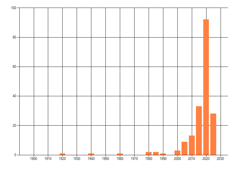 Het aantal atlasblokken (5x5 km) waarin de soort is gemeld binnen een periode van vijf jaar (vanaf 1980) of twintig jaar. Niet gecorrigeerd voor waarnemersinspanning en het aantal doorgegeven waarnemingen kan sterk variëren per periode, dus een trend in verspreiding kan hier niet direct uit worden afgelezen. Het opgegeven jaartal is het eerste jaar van de periode. Bron: gevalideerde waarnemingen uit de NDFF.