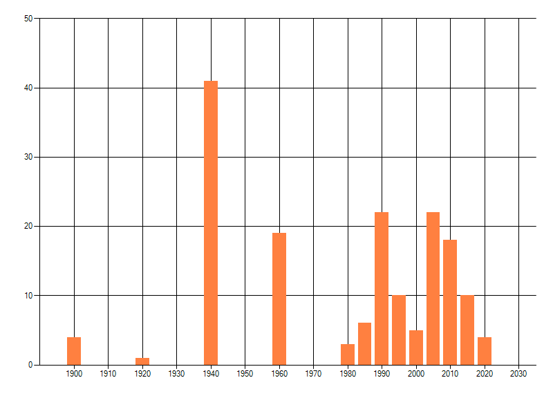 Het aantal atlasblokken (5x5 km) waarin de soort is gemeld binnen een periode van vijf jaar (vanaf 1980) of twintig jaar. Niet gecorrigeerd voor waarnemersinspanning en het aantal doorgegeven waarnemingen kan sterk variëren per periode, dus een trend in verspreiding kan hier niet direct uit worden afgelezen. Het opgegeven jaartal is het eerste jaar van de periode. Bron: gevalideerde waarnemingen uit de NDFF.